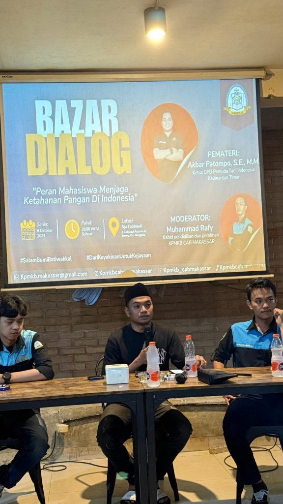 Makassar 6 Oktober 2025 – Komunitas Pelajar dan Mahasiswa Kabupaten Berau (KPMKB) Cabang Makassar menggelar kegiatan Bazar Dialog bertajuk “Peran Mahasiswa Menjaga Ketahanan Pangan di Indonesia” di Sija Toddopuli, Kota Makassar.